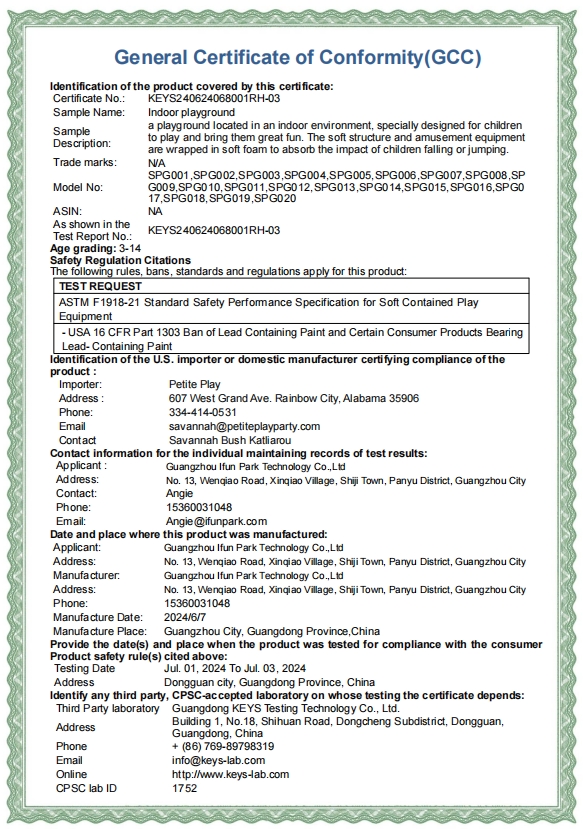 • ASTM F1918 / F1487ASTM Safety Standards from the U.S. — covers indoor playground equipment